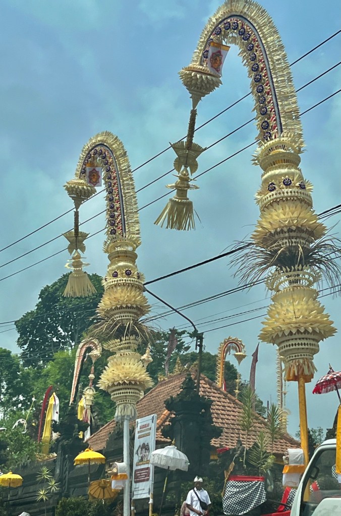 The first photo is the bamboo structure called penjor represents good luck and can be found when entering temples in Bali.