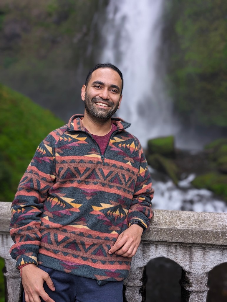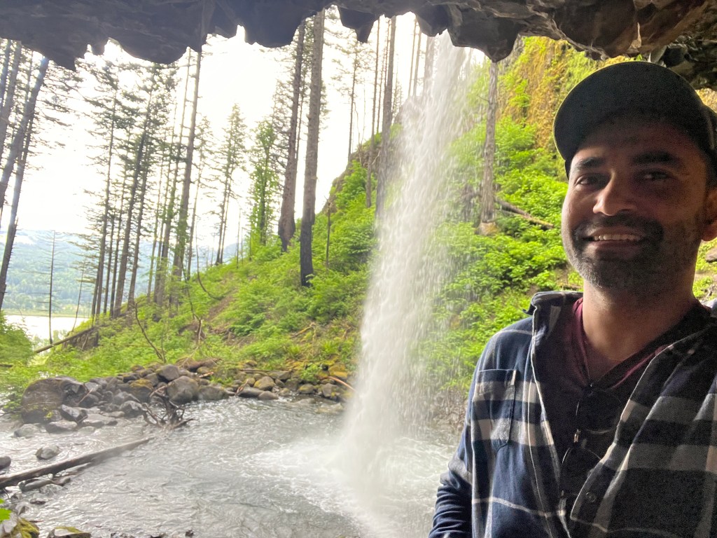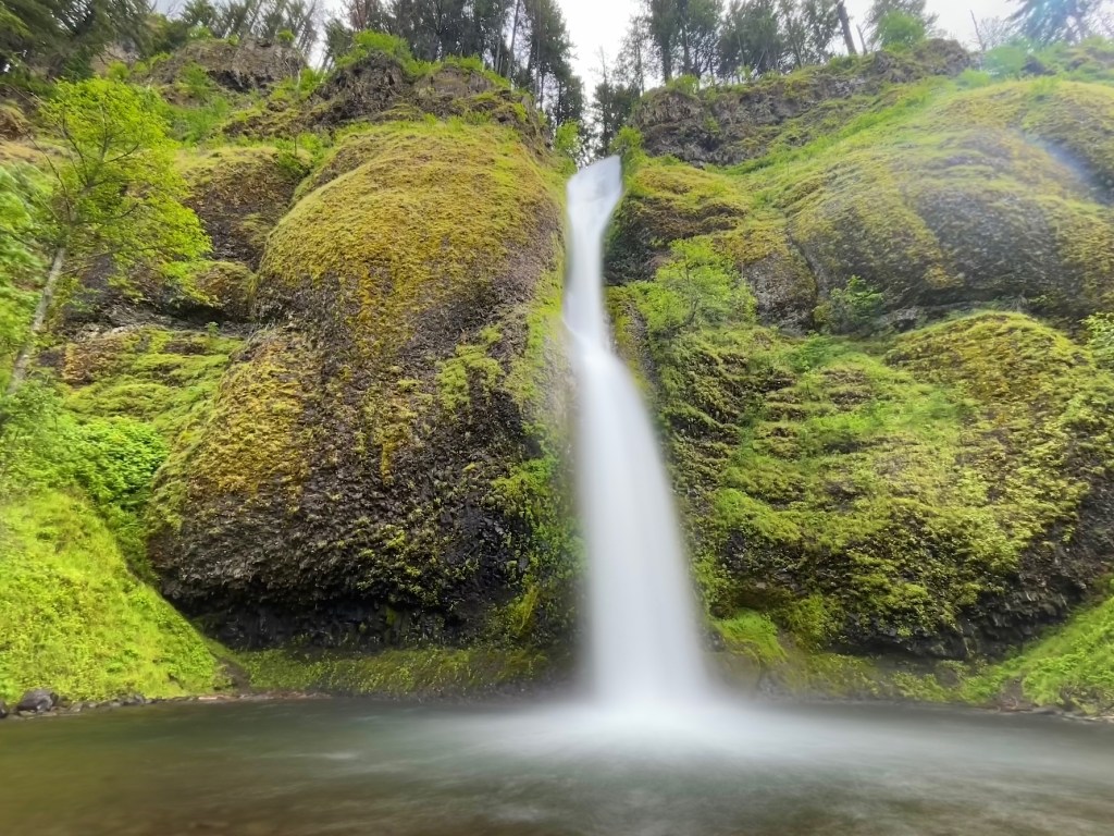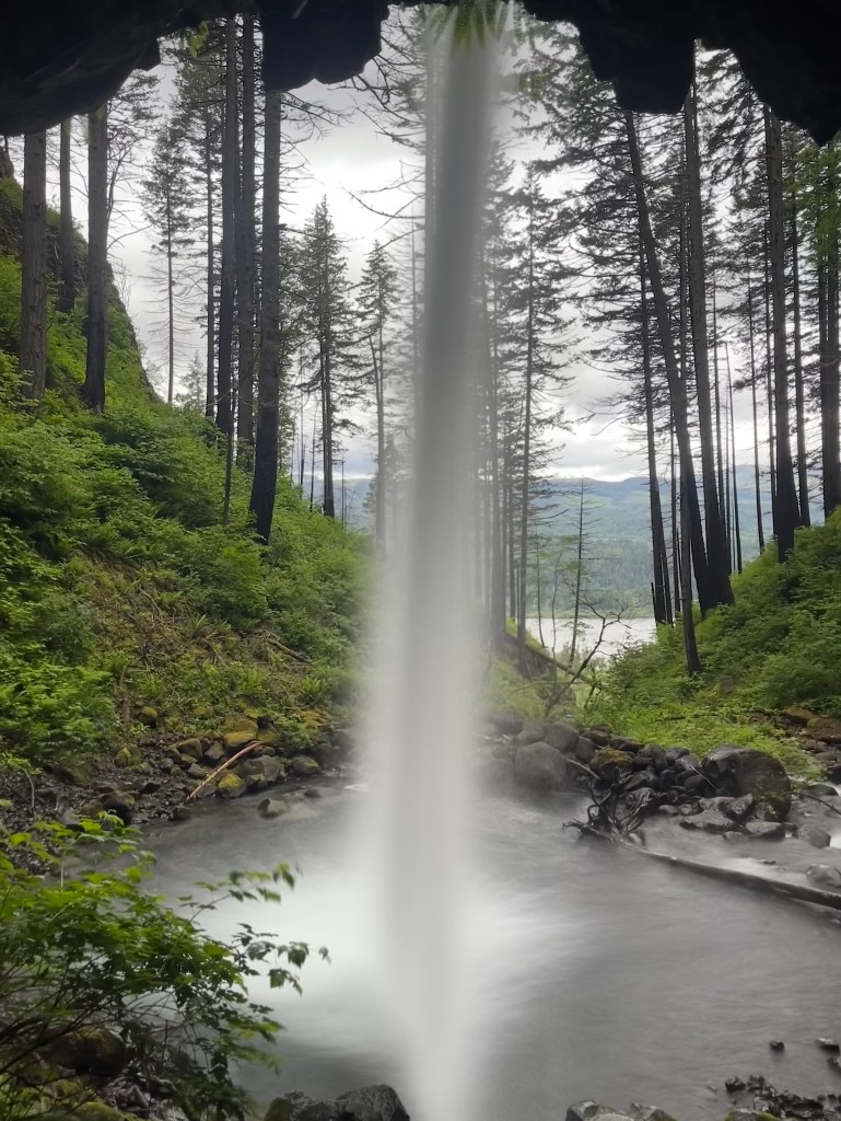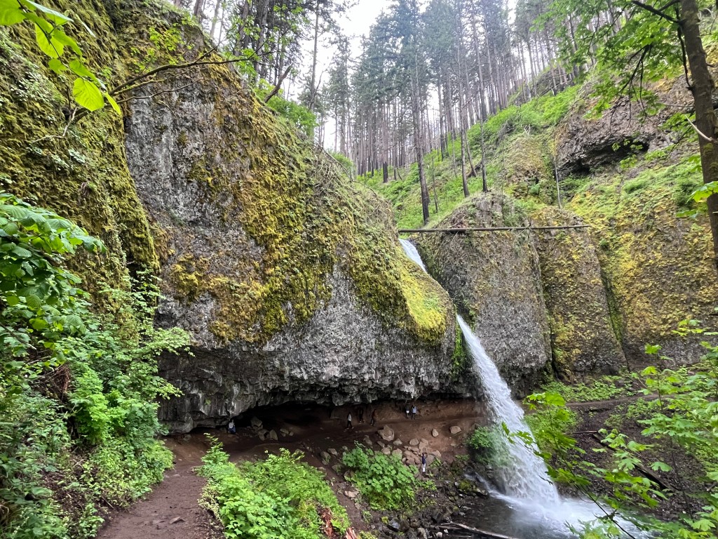 After 0.4 miles / ~30 mins , the trail suddenly turns into the small ravine containing Ponytail Falls. The trail passes behind Ponytail Falls in a cavernous overhang at a soft layer between Columbia River Basalt flows.