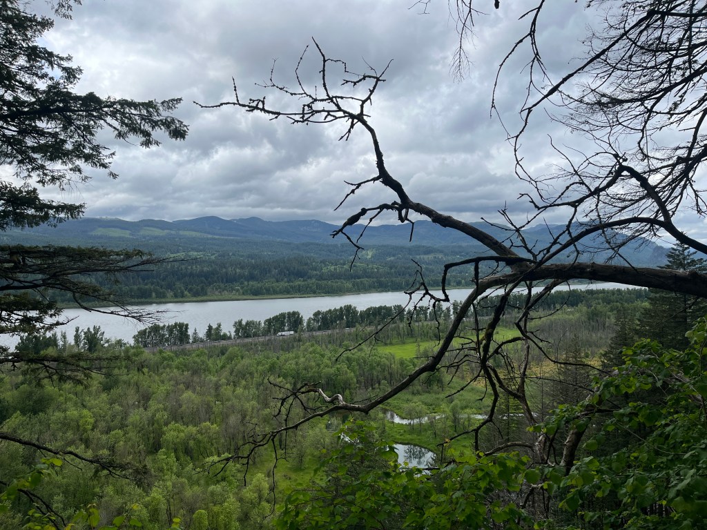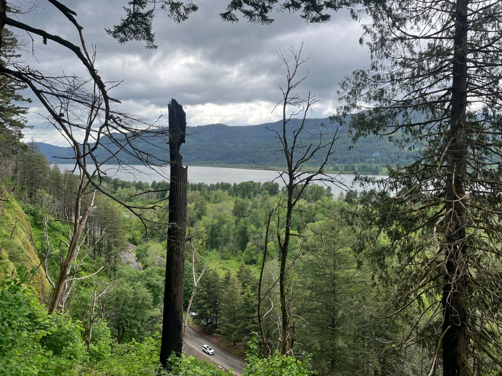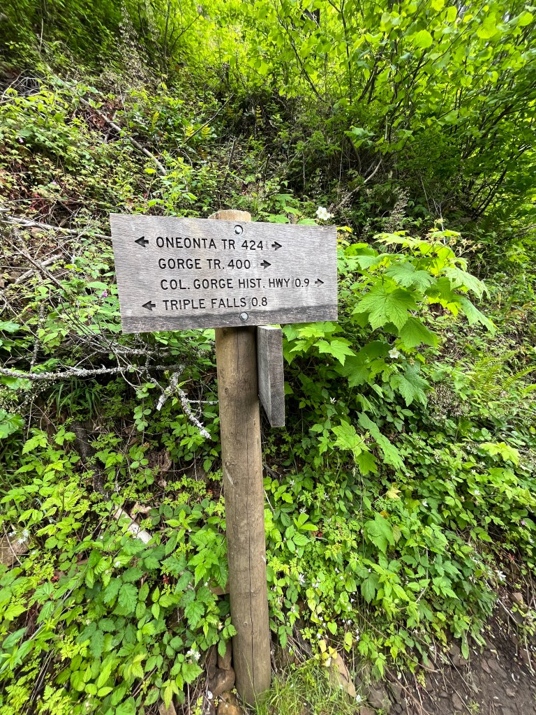 To complete the loop, turn right and head down the Oneonta Trail. Then you’ll come to another junction with the #400 trail, this time heading west toward Multnomah Falls. Turn right here to stay on the Oneonta Trail, and head down steeply to the Historic Highway, getting views of Archer Mountain across the river.