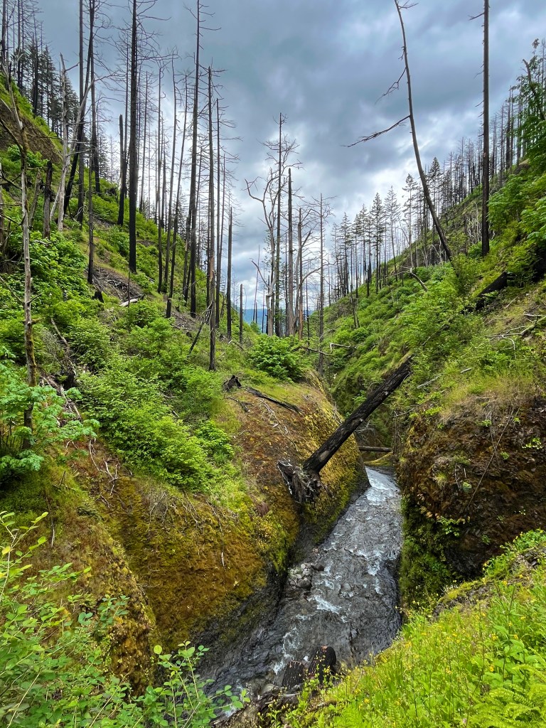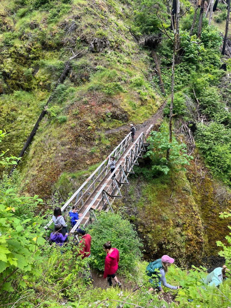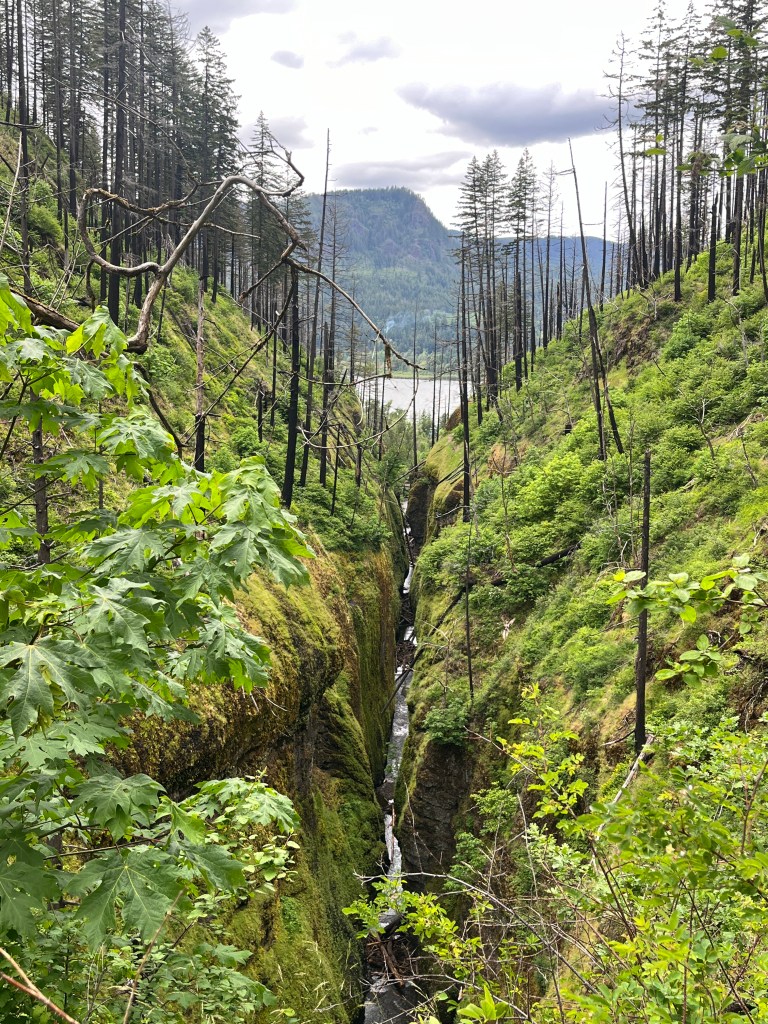 The main trail continues into Oneonta Gorge, where the 2017 Eagle Creek Fire scorched hillsides in a raging canopy fire. The trail crosses Oneonta Creek on a metal bridge, which somehow remained unscathed from the Eagle Creek Fire. Just above the bridge is Middle Oneonta Falls, a 15-foot drop. Just below the bridge, the creek disappears over the brink of Oneonta Falls into Oneonta Gorge.