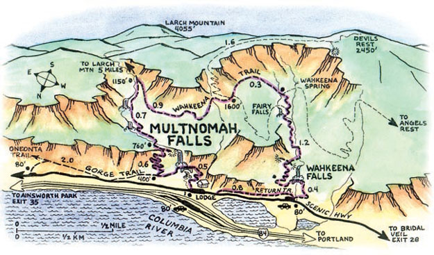 If you’re not yet ready to turn back, consider continuing on a 5.4-mile loop to see the area’s other waterfalls. From the viewpoint at the top of Multnomah Falls, follow the Larch Mountain Trail up Multnomah Creek 0.7 mile. Then turn right on the Wahkeena Trail. This path climbs for 0.9 mile and then descends past Fairy Falls to an elegant stone bridge below Wahkeena Falls, a 242-foot triple cascade in a sculpted chute.