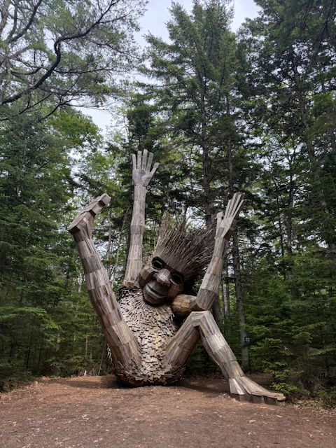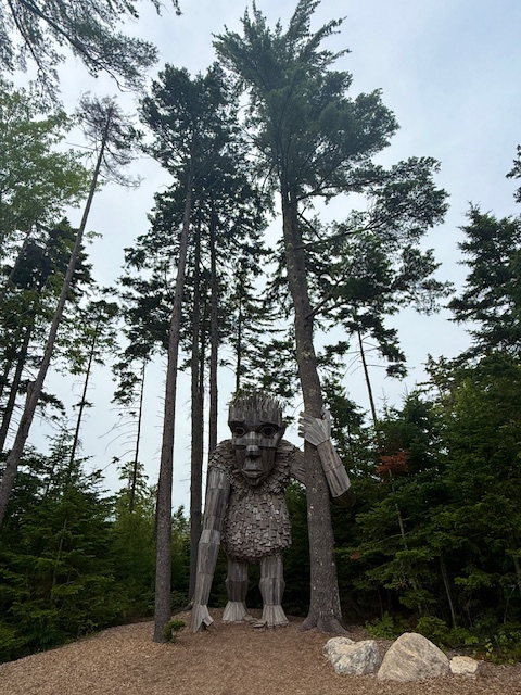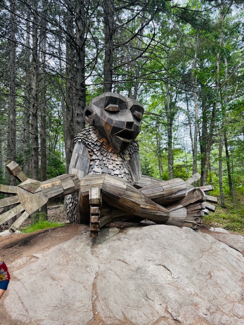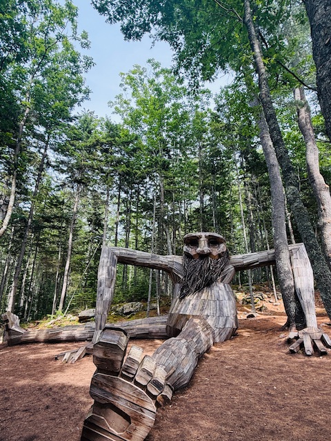 But wait, before waving goodbye to Maine, we took one last detour to Boothbay’s magical Coastal Maine Botanical Gardens. Hidden among winding forest paths, we discovered the whimsical world of Thomas Dambo’s “Guardians of the Seeds”: five towering troll sculptures crafted from recycled wood, each watching over their corner of nature.